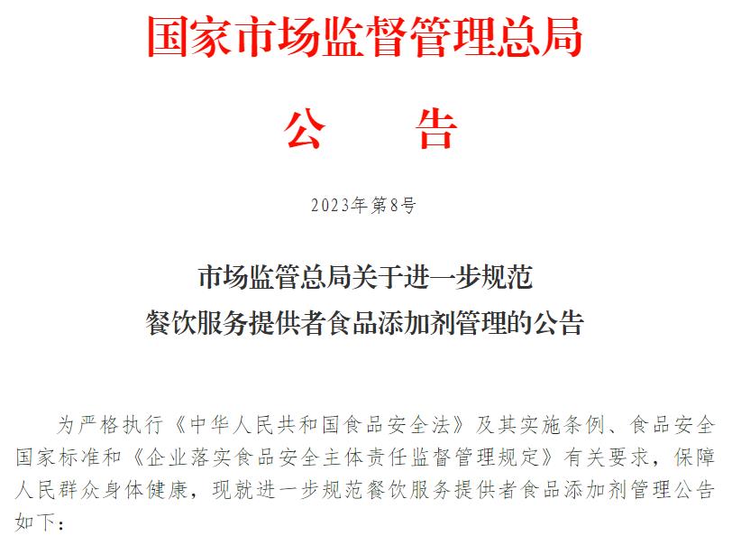 :近来,商场监管总局发布《关于进一步标准餐饮服务提供者食物添加剂办理的公告》。详细如下:
